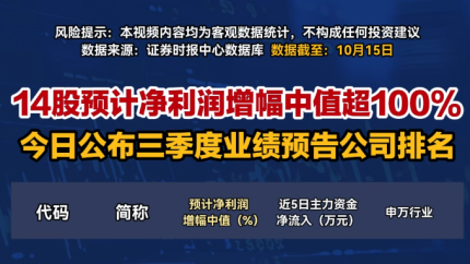 14股預計凈利潤增幅中值超100% 今日公布三季度業績預告公司排名